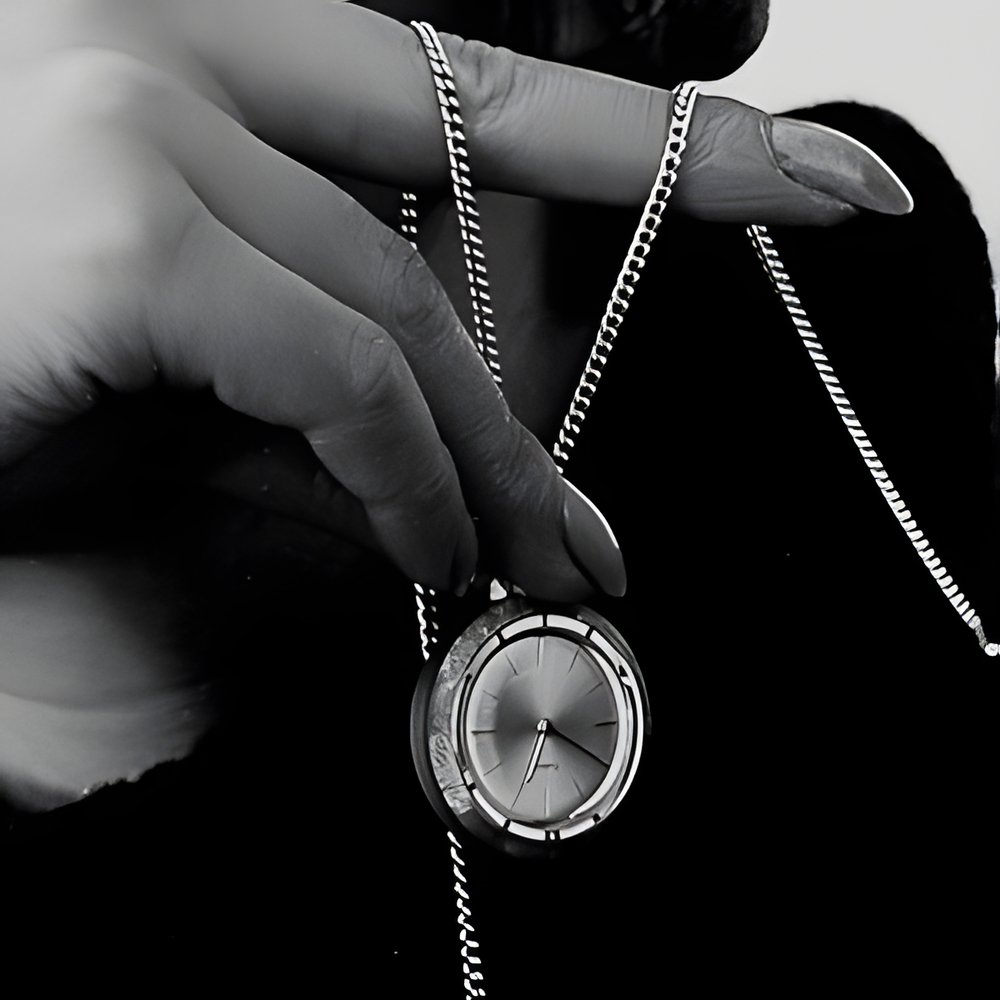 Pendant watches remain in the forefront of timekeeping high fashion-. This one, in medallion style, is in silver. By Zodiac.