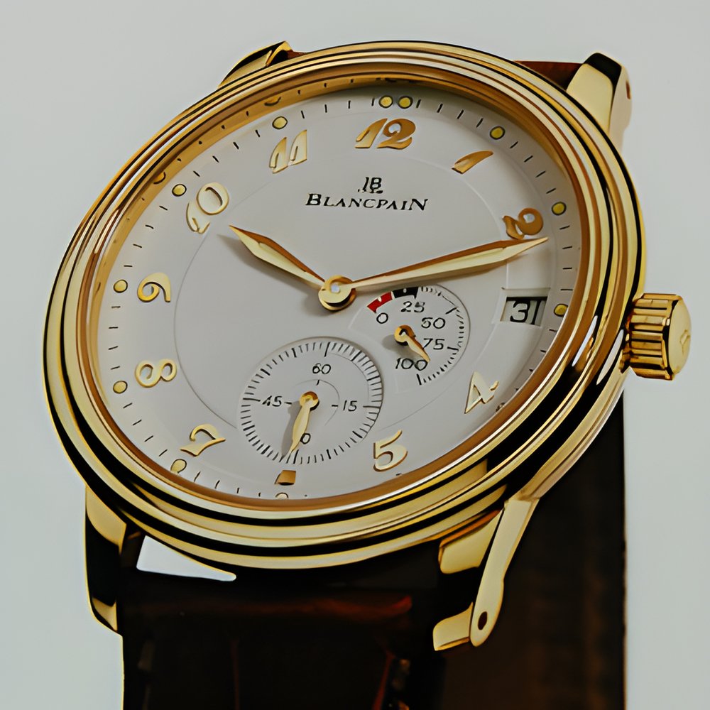 The new 2000 model is the same, yet different. It has the same shaped case, ultra-slim hand-wound complicated movement, date at 3 o’clock and noble materials. New features include the Blancpain Arabic numerals on a white or black dial, and the superposing of two counters : small seconds at 6 o’clock and 100-hour powerreserve at 4 o’clock. Available in 750 (18K) yellow gold or stainless steel on a matching bracelet or leather strap, it is water-resistant to 30 m.