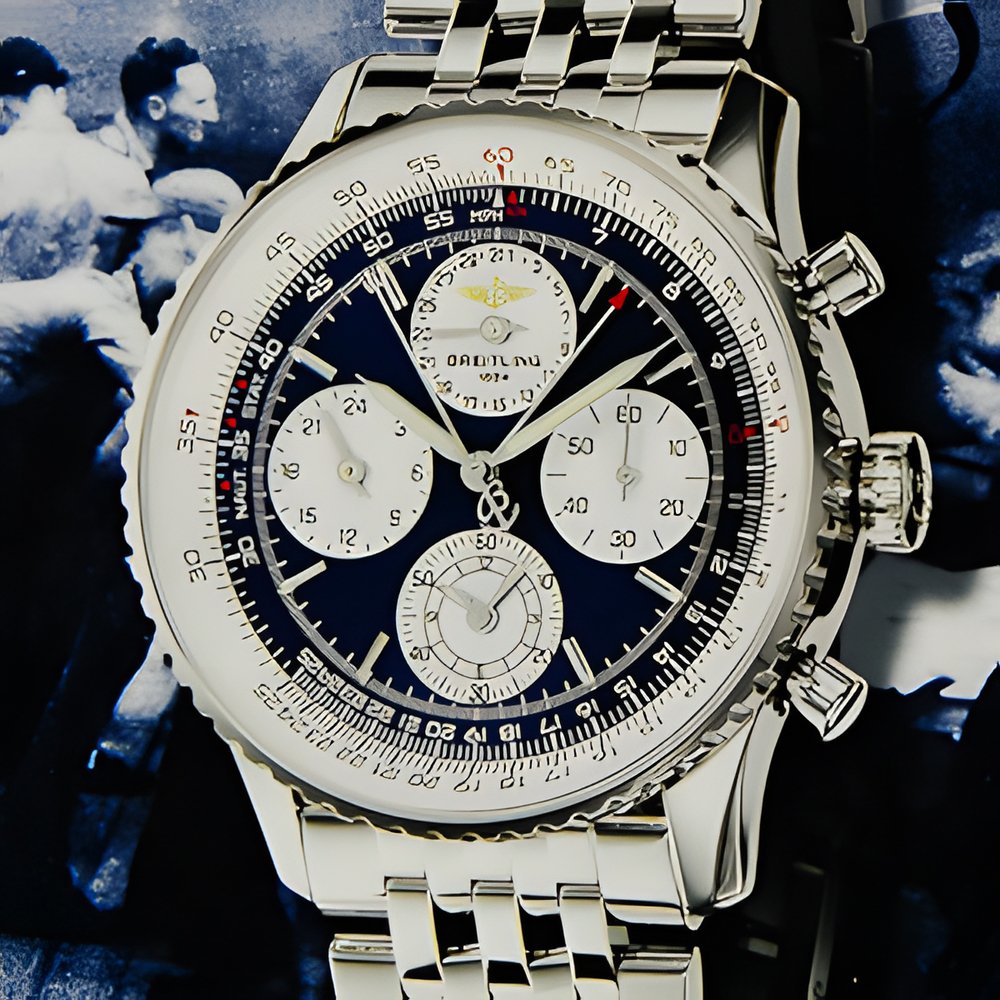 This new instrument provides two distinct totalizer readouts of the minute. The first is located at the center of the dial and runs in tandem with that of the seconds. The second, at 6 o’clock, is a combined two-hand totalizer providing a readout of both hours and minutes. Ideally designed for displaying measured times of over 60 minutes, this configuration allows the Twinsixty’s owner to read elapsed times exactly as he would on a standard watch dial. Breitling Caliber 39, high-frequency selfwinding chronograph, 37 jewels, analogue calendar and 24-hour readout. Measures short times to 115’ second. Steel case, water-resistant to 30 m. Rotating bezel with circular slide rule. Cambered sapphire crystal, glareproofed on both sides. Leather, sharkskin or crocodile strap. Navitimer bracelet.
