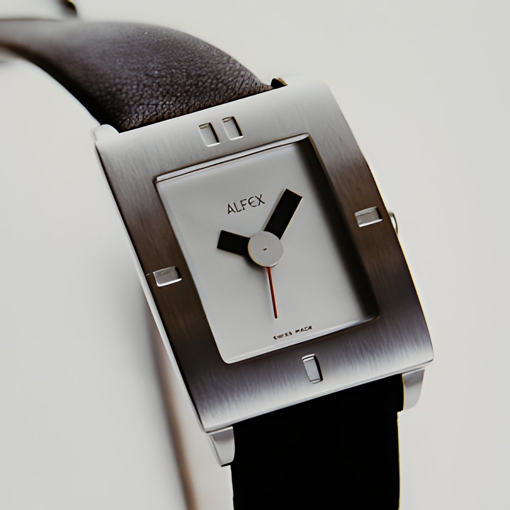 A masculine model styled around the rectangle : the brushed steel case, the hour markers engraved on the bezel, and the hands (black for the hours and minutes, red for the seconds) brought together under a matt silvered disc. The water-resistant case is fitted with a quartz movement and comes with a silver or anthracite dial. Leather strap. Cambered mineral glass.