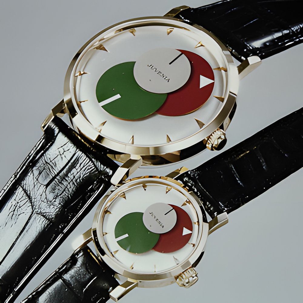 Round hands move like planets around the dial of this 1950’s model, a replica of the original design but adapted to modern technology. Designed for both men and ladies, the 750 (18K) yellow, pink or white gold case is fitted with a mechanical movement. Water-resistant to 30 rn. Sapphire crystal.