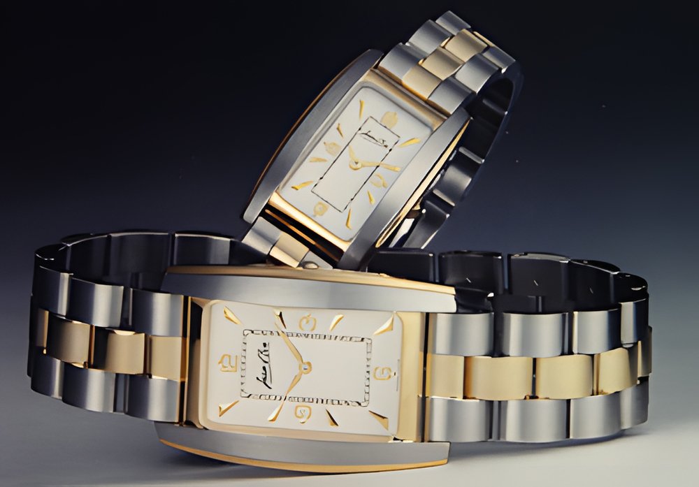 This curved rectangular model is fitted with a quartz movement and available in steel, 10-micron gold-plated or bimetallic versions on a leather strap or metal bracelet with folding clasp. Water-resistant to 30 m, screw-down back, scratch-resistant sapphire crystal. Available in men’s and ladies’ versions as well as a unisex version with two time zones.