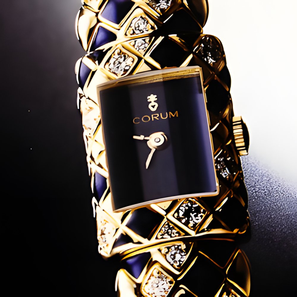 In keeping with Corum’s creative tradition of combining beautifully shaped forms with a craftsman’s care and a constant search for beauty, the «Arlequin», fashioned in 18K gold, has an unusual case in the form of a semicylindrical baguette whose lines are skilfully extended to marry with the curve of the bracelet. Decorated with alternating fired enamel lozenges and set with 43 brilliants (2.70 Ct), the bracelet and bezel reflect the expertise of Cor-urn’s master jewellery watchmakers. An exquisite lacquered blue dial adds the final touch to this magnificent jewellery watch, which also features a Swiss precision quartz movement.