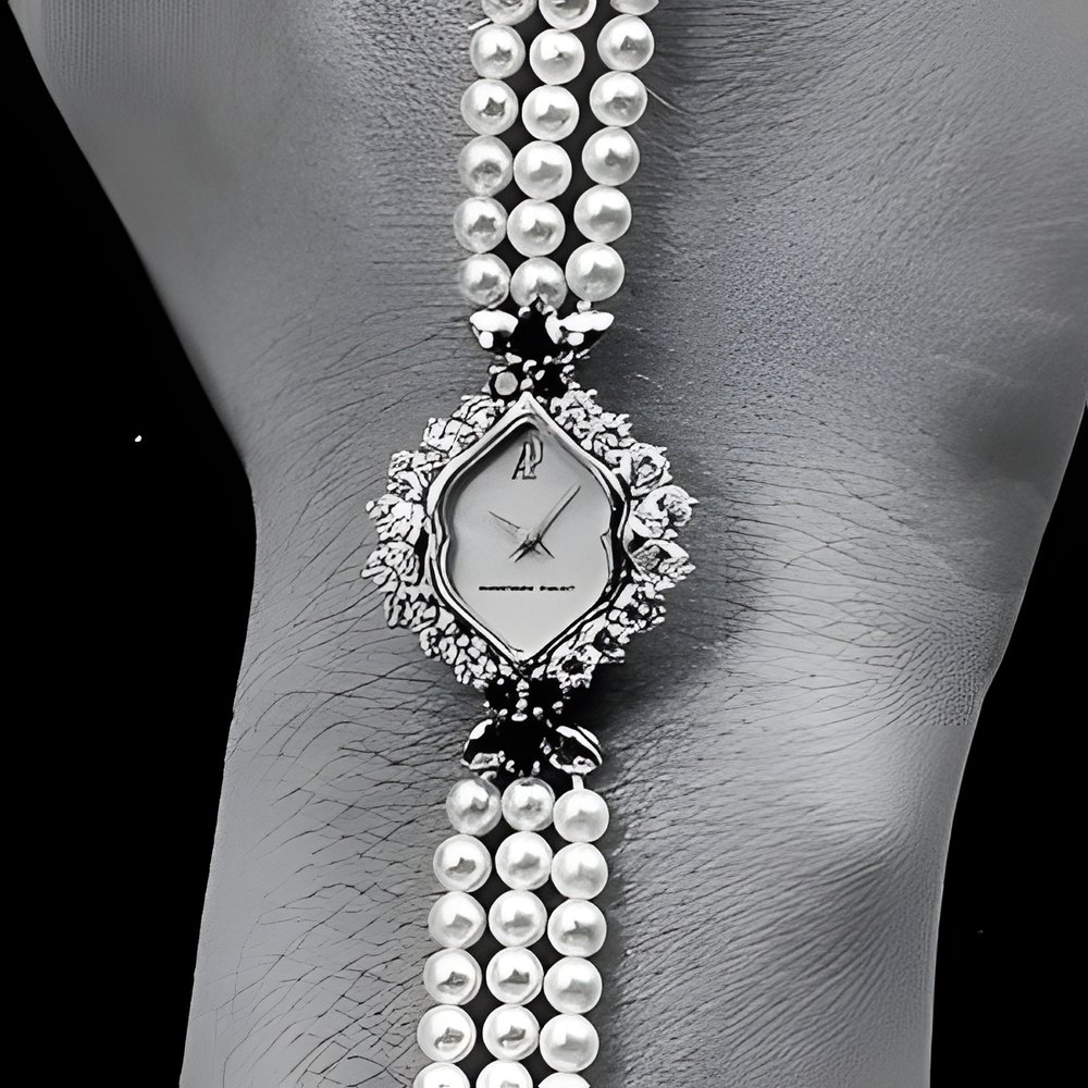 Pearls are enjoying a comeback in luxury time: this Audemars Piquet jewellery watch combines two current trends: slim, graceful lines and a bracelet composed of three strands of pearls - they are back in strength in the arts of adornment. “Navette” style yellow gold case, bezel embellished with brilliant-cut diamonds and rubies. (AUDEMARS PIGUET)