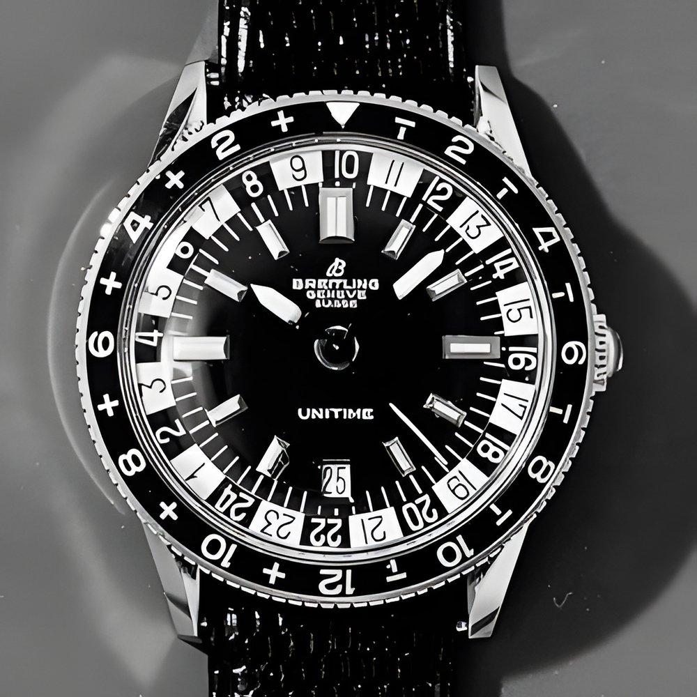 Long distance transportation timing problems are solved instantly by this watch designed for pilots, ships ’ captains and world travellers. Central dial shows local (or GMT) time, an automatic 24-hour rotating outer chai make it possible to obtain the correct time anywhere in the world. In addition, a movable bezel (outer rim) permits the addition or subtraction of hours for countries where local time differs from the time of the time-zone.