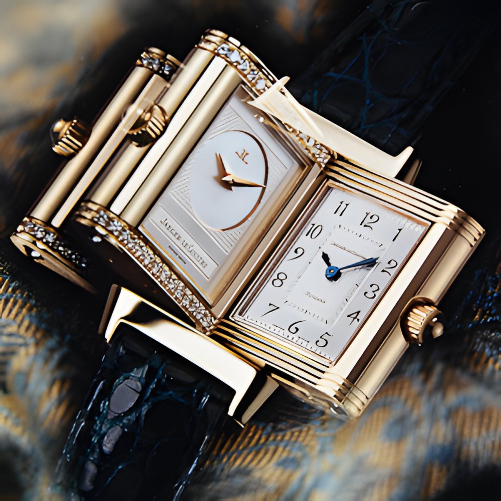 Two faces for this 750 (18K) yellow gold ladies’ model on a crocodile strap with folding clasp. Front, a classic, silvered guilloché dial decorated with floral numerals; back, a sparkling motherof-pearl dial set with 32 full-cut diamonds. Hand-wound, Jaeger-LeCoultre calibre 844 mechanical movement with double hand-fitting.