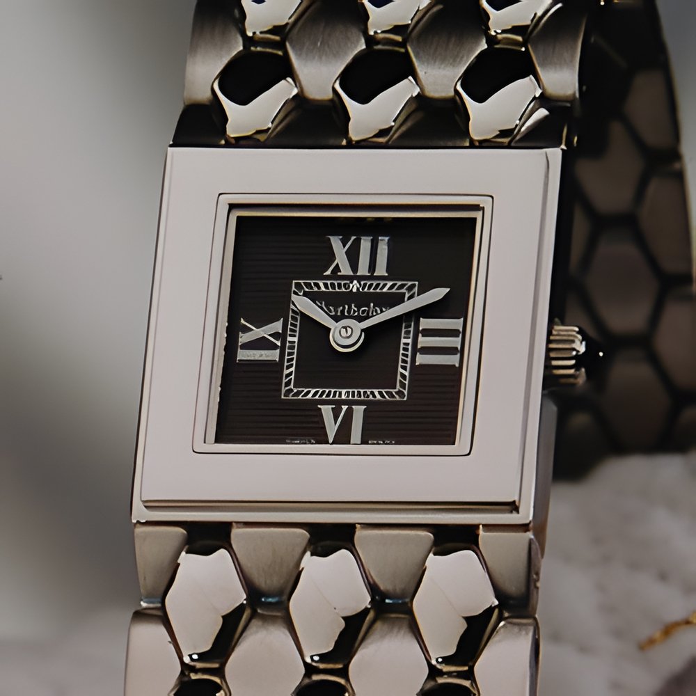 Like a precious ribbon wound around a woman’s wrist, this extremely supple honeycomb bracelet is perfectly integrated with the square case. With a quartz movement, sapphire crystal, double-edged hands, a cabochon onyx set in the winding crown, and invisible clasp, it is waterresistant to 50 m. The Sloanes come in several versions with 5- or 7-row bracelets featuring contrasting matt/polished stainless steel links or two-tone links, a choice of guilloché anthracite, mother-of-pearl or silvered dial set with 12 diamonds or diamond-paved, and white or black hands. A diamond-set bezel is also available.