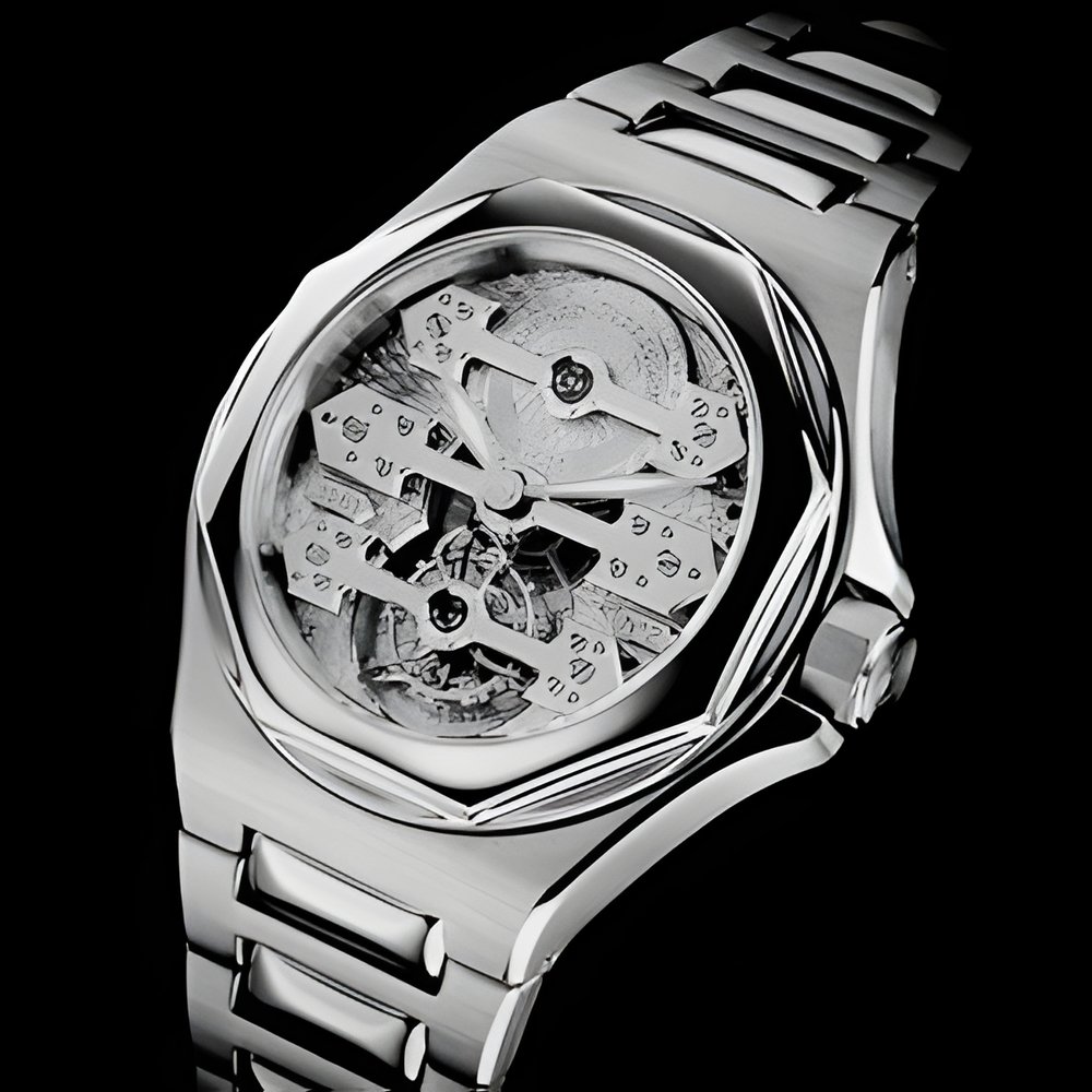 This new, sporty model features the highly-recognizable Tourbillon with Three Gold Bridges fitted into a stainless steel Laureato case. The movement with its wide, solid bridges, the Manufactory’s distinctive signature, can be admired through the sapphire crystal. Water-resistant to 50 m. Also available, on request, in yellow, pink or white gold.