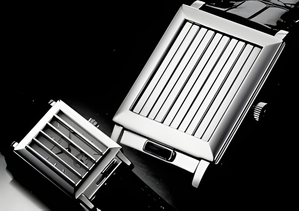 Inspired by a model created in the 1930’s, this “Jalousie” wristwatch belongs to Vacheron Constantin’s “Les Historiques” collection. Its originality lies in a unique system of shutters which cover the dial and can be opened and closed with a small slide set with a cabochon sapphire. Its rectangular waterproof case is in 18K pink gold, setting off the white gold of the shutters. The hand-winding mechanical movement features a seconds hand at 6 o’clock. In keeping with its strong character, this timepiece has a white dial with blue steel hour markers.