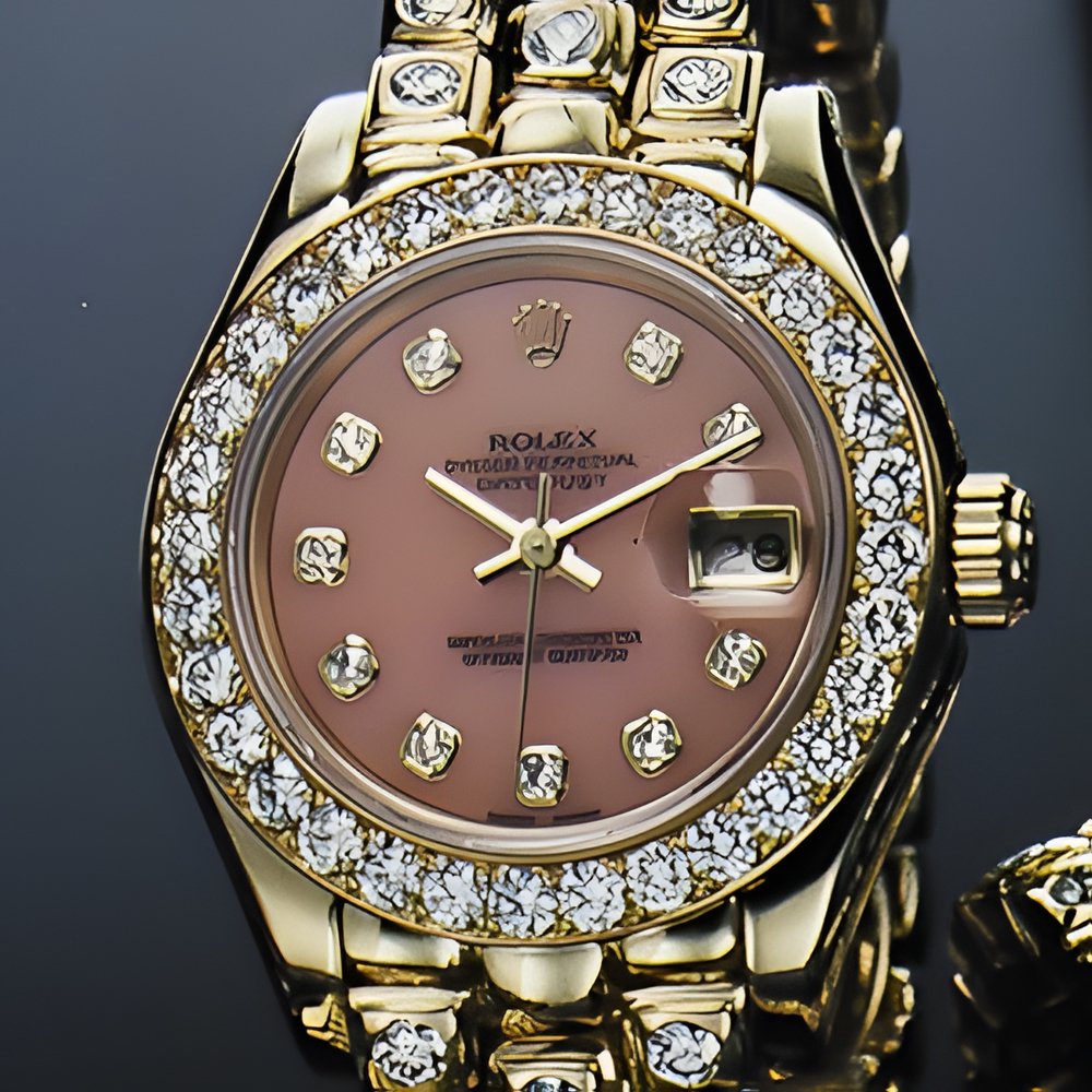 Brilliant-cut diamonds set into precious metal compose a fabulously feminine jewelled suite, comprising a «Oyster Perpetual Lady Datejust» chronometer in 18K gold, set with 132 brilliant-cut diamonds weighing 8.12 carats, a necklace enhanced with 96 brilliant-cut diamonds representing 8 carats, a pair of earclips carrying 60 brilliant-cut diamonds (4 carats) along with a ring whose 44 brilliant-cut diamonds weigh 3 carats in all.