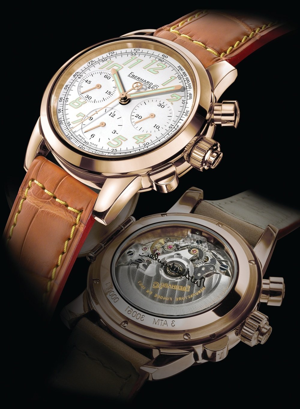 Dedicated to one of the finest victories of racing driver Tazio Nuvolari, this chronograph has a co-axial pushbutton on the crown and a vertically-sliding pushbutton that opens the cover to reveal a finely-worked, personalised movement.