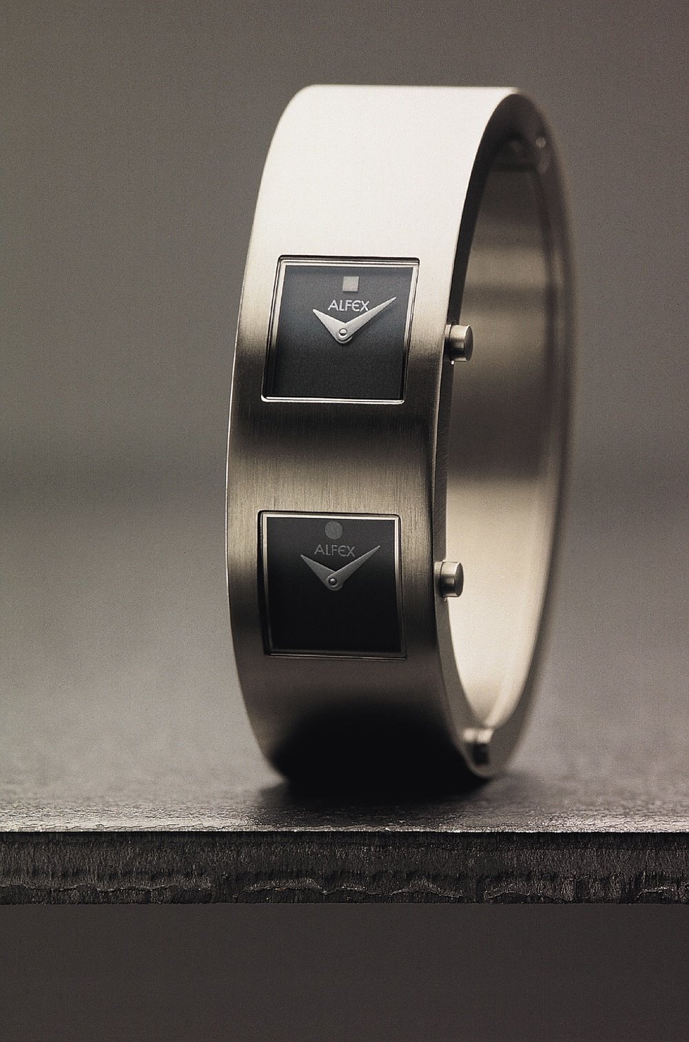Moments is a very avant-garde collection of watches, all designed by contemporary artists. Designed by Georg Plum, the 5400 is characterized by its perfectly geometric construction. Two time-zones are indicated on two dials that are almost square and fitted into an oval brushed steel bracelet. The pushpiece for opening the bracelet reflects the design of the crowns.
