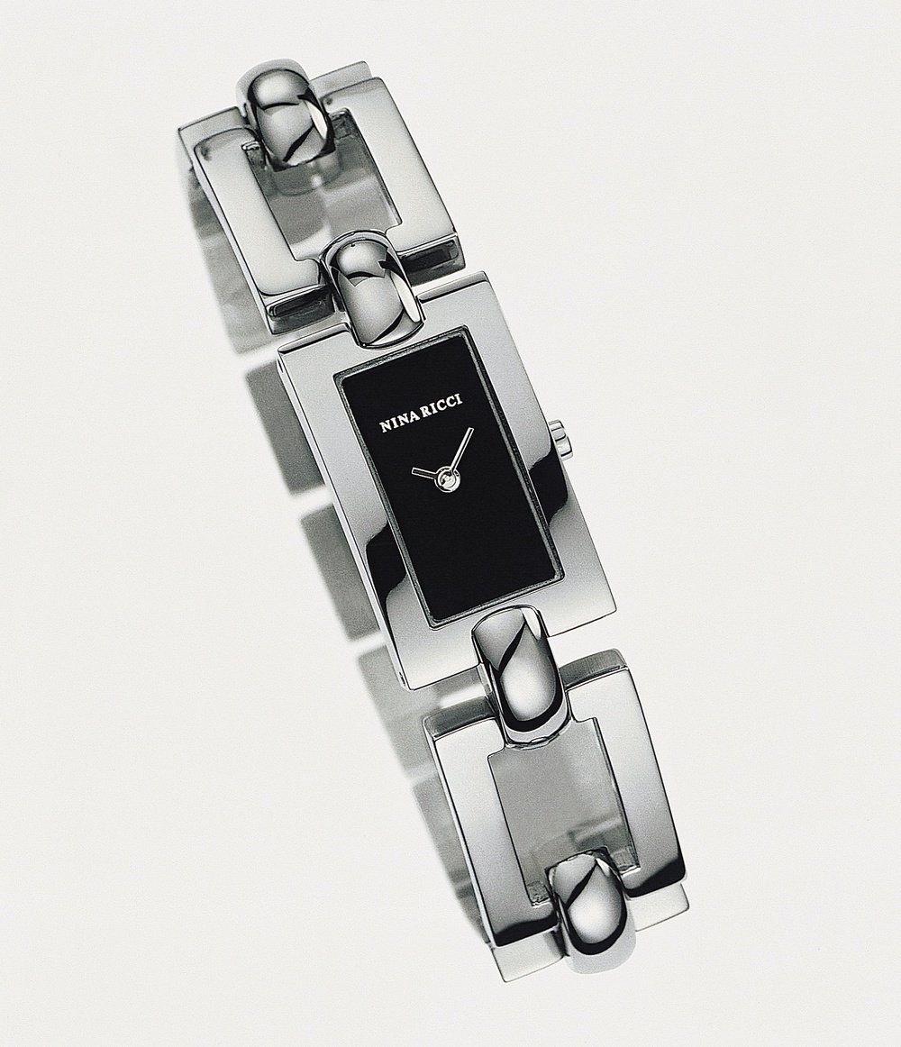 Nina Ricci’s latest model is stamped with purity. Simple but feminine, it is an appealing blend of style and functionality. The pure steel rectangular case with rounded angles houses a Swiss movement and is harmoniously extended by a bracelet whose links add a touch of lightness and vigour to this creation.