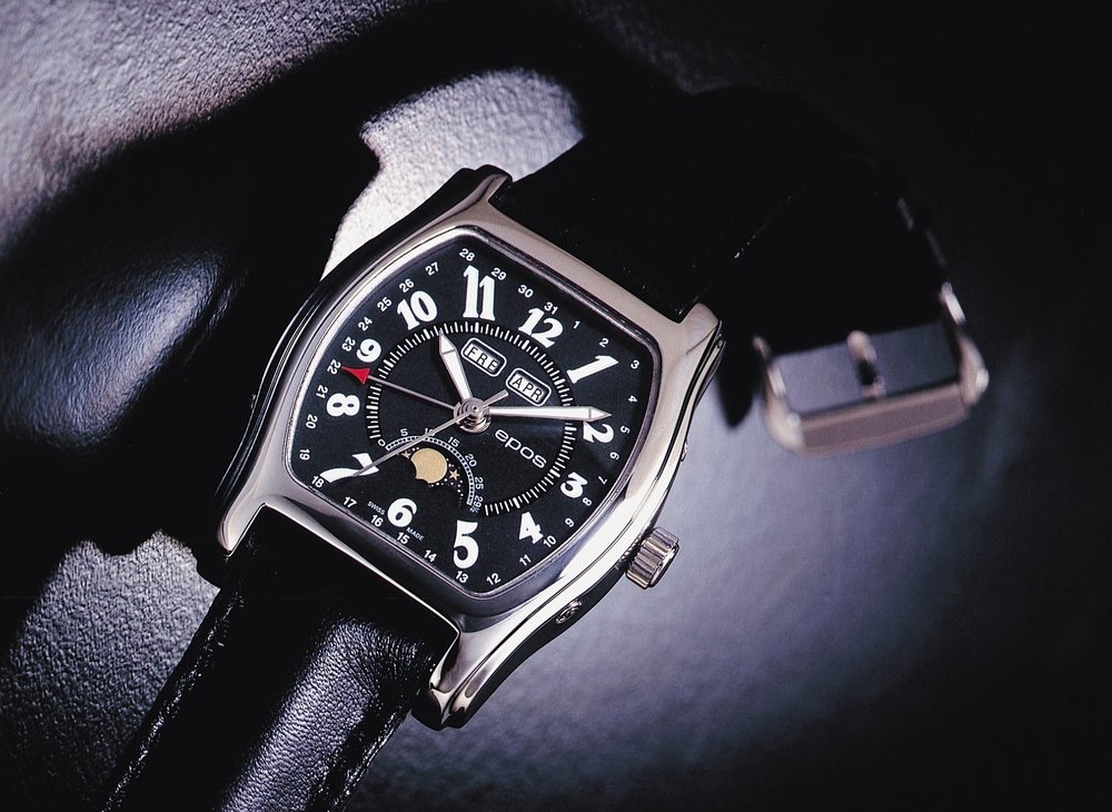 In a new addition to the retro Tonneau collection, Epos is offering an automatic calendar model with a central date hand, day and month windows at 12 o’clock, and moon phases at 6 o’clock. The case is steel and features a transparent back.