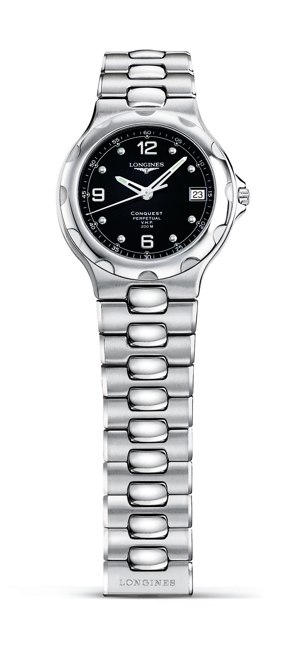 The Conquest VHP Perpetual propels quartz technology to the limits, attaining a precision of approximately ±10 seconds a year thanks to an integrated thermo-compensating circuit which automatically and permanently reduces the variations. The movement is fitted with a perpetual calendar programmed until 2100 which displays the date in a window is at 3 o’clock.