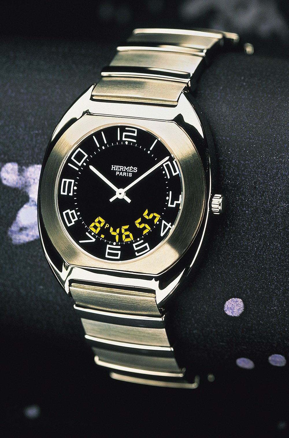 On the threshold of the third millennium, Hermès offers a resolutely modern watch with aerodynamic lines, equipped with a double display and multiple crown-operated functions. The date, countdown function, second time-zone, chronograph and alarm are displayed on the digital screen.