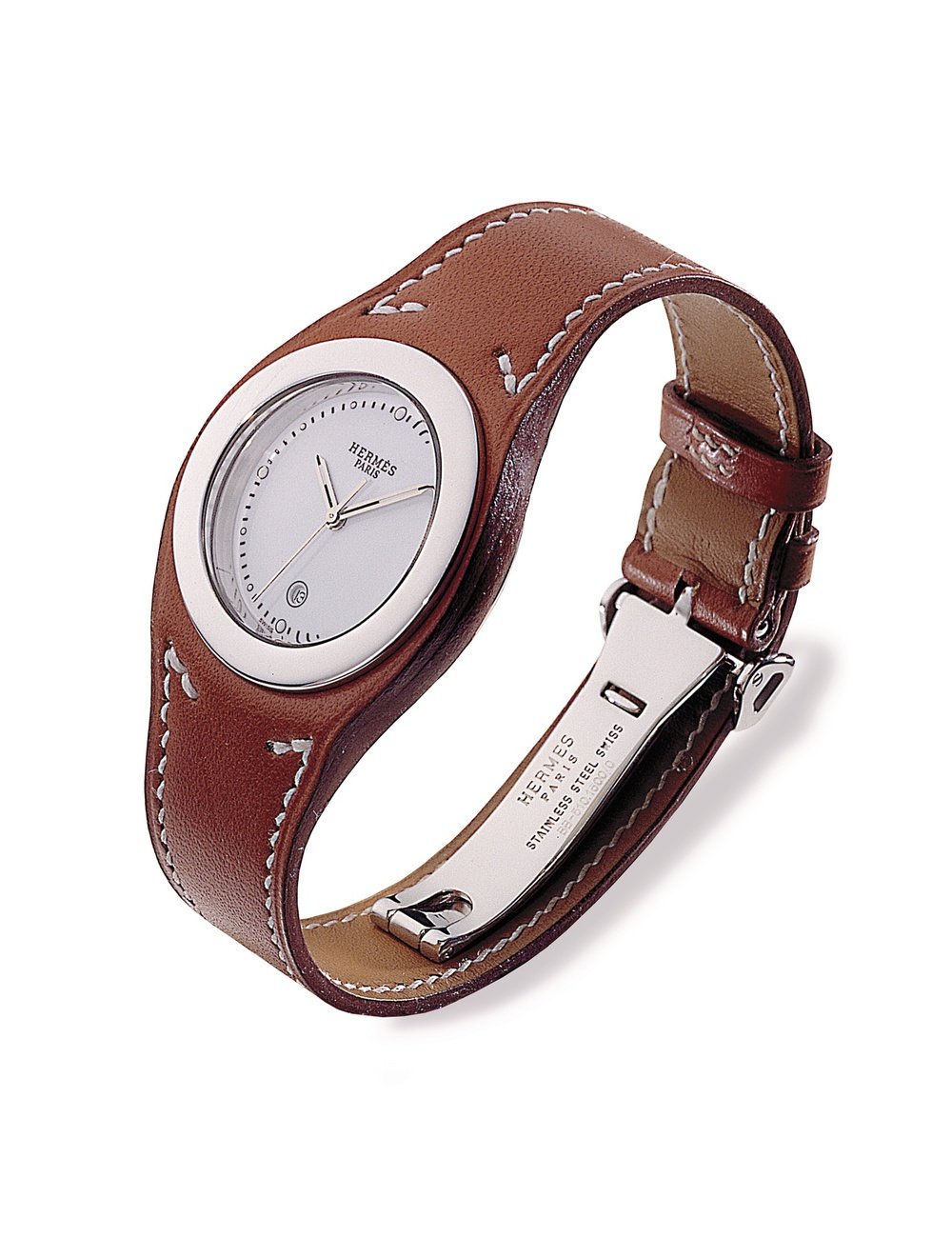 Hermès presents a new version of the Harnais model it created in 1996. Set into the leather strap, its curved case marries perfectly with the shape of the wrist. The dun or black strap, made of the same bridle leather used by Hermès since its foundation for bridles and saddles, is entirely hand-stitched.