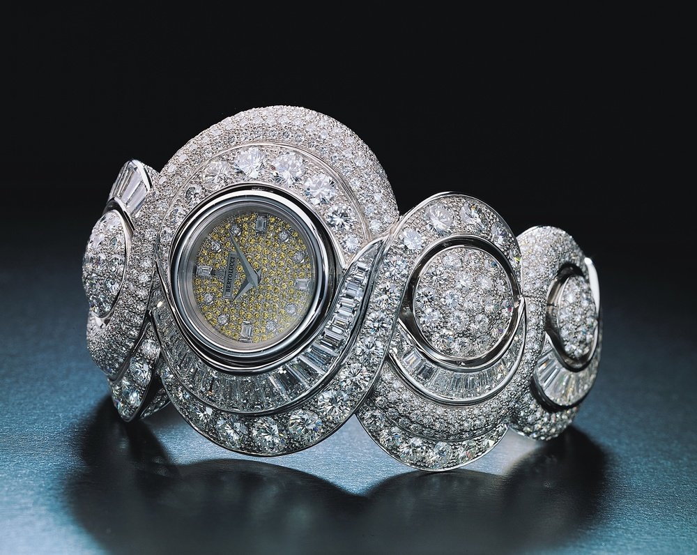 Each year, to reflect its philosophy and passion, Bertolucci presents an exceptional creation in a unique piece. The 1999 version, Pretiosa Eternelle, is in pure platinum with voluptuous asymmetrical curves set with a multitude of white diamonds. The dial, paved with yellow diamonds, enhances the incomparable brilliance of this sparkling jewel.