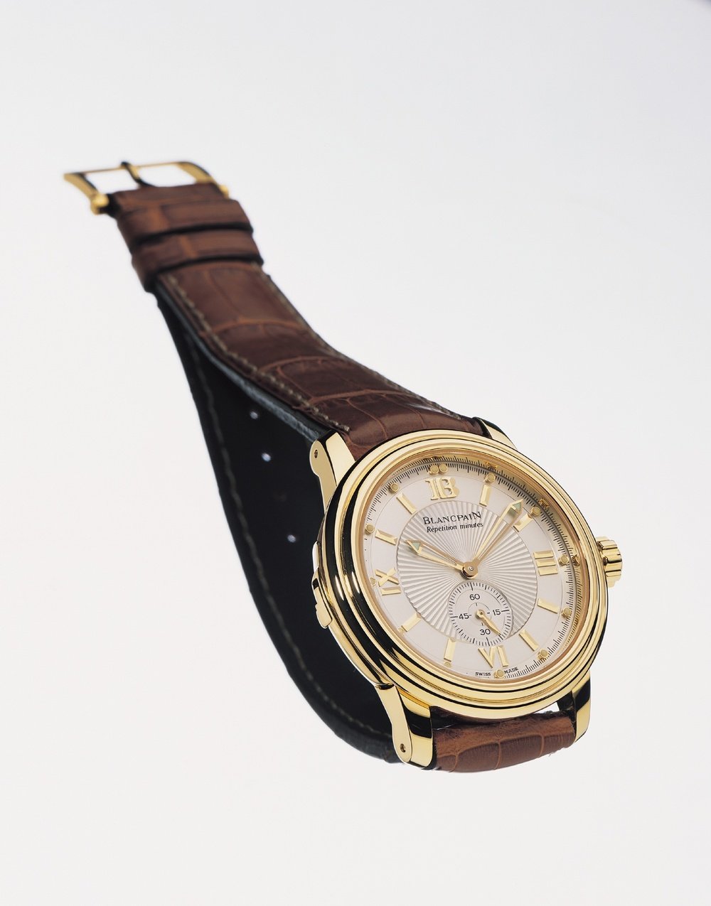 The 2135 is the first minute repeater wristwatch that is water-resistant to 30 m. It is fitted with an exclusive Blancpain-patented locking mechanism which seals the case. When it is open, the valve on the left side frees a spring inside that enables the repeater mechanism to be wound. To ensure total water-resistance, though, it must be closed. This blocks the repeater mechanism. This exceptional watch has a yellow gold case from the 2100 line and is fitted with the famous automatic 0035 movement launched by the brand in 1988, one of the smallest and flattest of its kind.