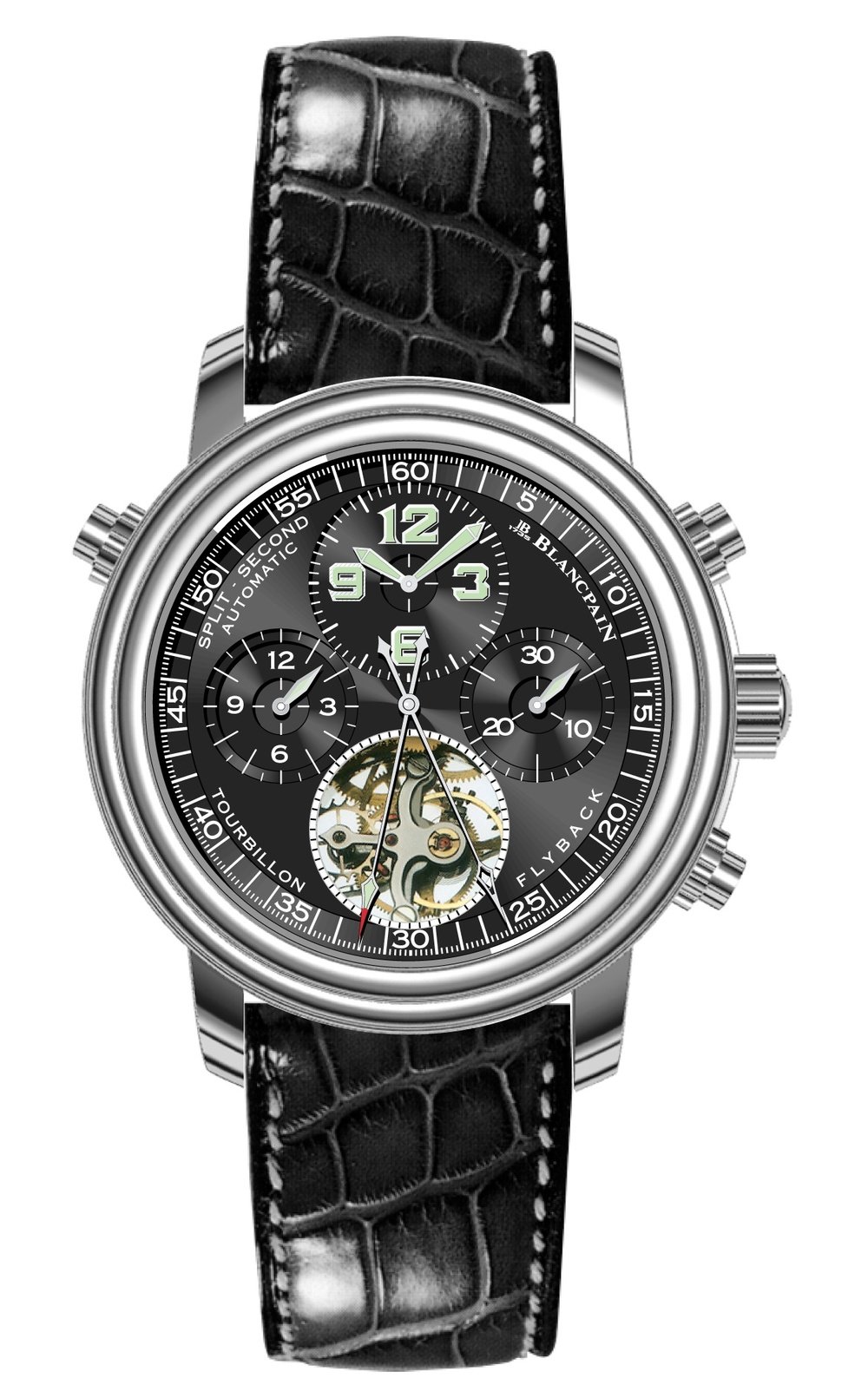 Blancpain is celebrating the 10th anniversary of its split-seconds chronograph by adding a tourbillon with an 8-day power reserve. Unique in its category, it will be the eighth Blancpain complication. Made in platinum in a limited series of 99 pieces, it indicates the hour on a sub-dial at 12 o’clock and the chronograph 30-minute and 12-hour functions at 3 and 9 o’clock respectively. The split-seconds chronograph hands are in the centre. Limited series of 99 pieces.