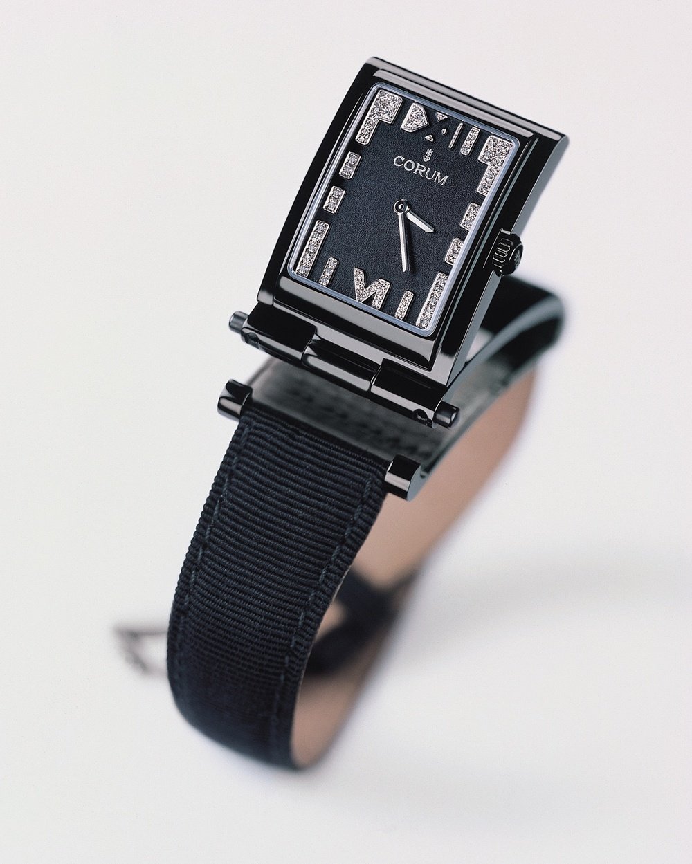 Dressed all in black and set with diamonds, the new Tabogan highlights the ingenuity of its design. The steel case, open on your desk or closed on your wrist, harmonises with the black dial and black rep strap. The hour ring scintillates with diamonds.
