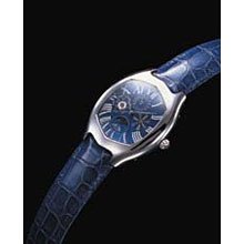 dazzling blue, displays the date, day, month and moon phases in a luxurious platinum case.