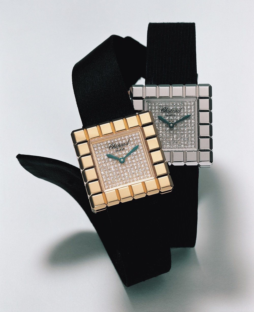 Designed by de Grisogono for Chopard, the exceptional and fascinating Ice Cube collection has a clean, pure and sparkling personality. This new version, fashioned with yellow or white gold cubes around a diamond-paved dial, shimmers on a black satin strap.