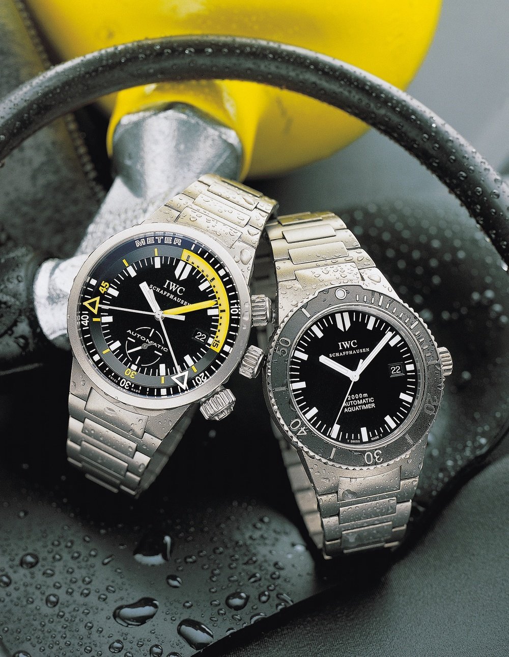 A great duo for divers : on the left, the Deep One, on the right, the Aquatimer, the only diver’s watch water-resistant to 2000 m. Deep One is an automatic watch that is water-resistant to 100 m and fitted with functions specially designed for professional divers. Thanks to an interior rotating ring operated with the crown at 2 o’clock, it can record the length of a dive and the depth to 45 m. The bathometer is operated with the crown-valve at 4 o’clock.These automatic precision instruments come in a titanium case from the GST line, and on a matching bracelet. A Velcro® strap is included so they can be worn on a diving suit.