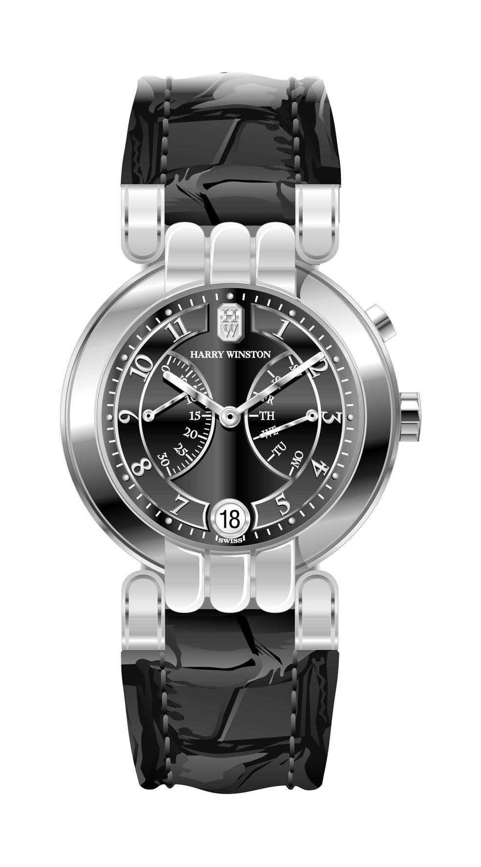 Faithful to its image as a creator of exceptional timepieces, Harry Winston presents the first watch with bi-retrograde display, manufactured in the tradition of grand complications. The mechanical module, developed on a prestigious Girard-Perregaux automatic movement and produced exclusively for the jeweller, indicates the seconds and the day in two 120° sectors situated at 9 and 3 o’clock. Fourteen months were needed to create this gold watch and only 125 hand-crafted pieces will be produced in 1999.