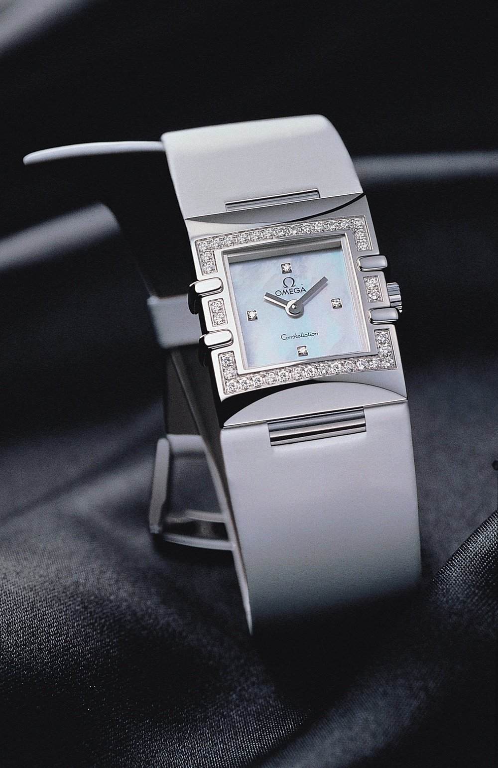 The latest jewellery watch from Omega is dedicated to women. This addition to the Constellation collection promoted by Cindy Crawford adds a very trendy touch to the ladies’ line. The steel case has taken on a purer look with its curved square shape extending the lines of the bracelet, while preserving the four claws, the diamond-set bezel and the highly polished finish of the other My Choice models. In keeping with this new geometric simplicity, the white mother-of-pearl dial has baton hands and four diamond hour markers.