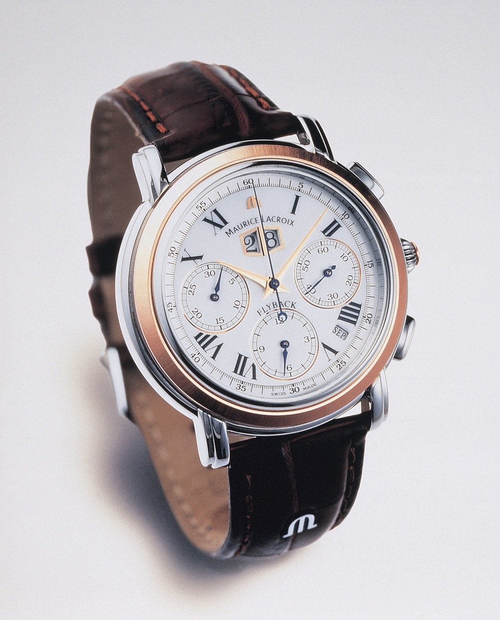 This new model in the Masterpiece collection combines a split-seconds chronograph and annual calendar. The steel case has a pink gold bezel and is fitted with a solid silver dial pierced with the brand’s exclusive large date window at 12 o’clock and the month window between 4 and 5. The hand-decorated movement is visible through the transparent back.