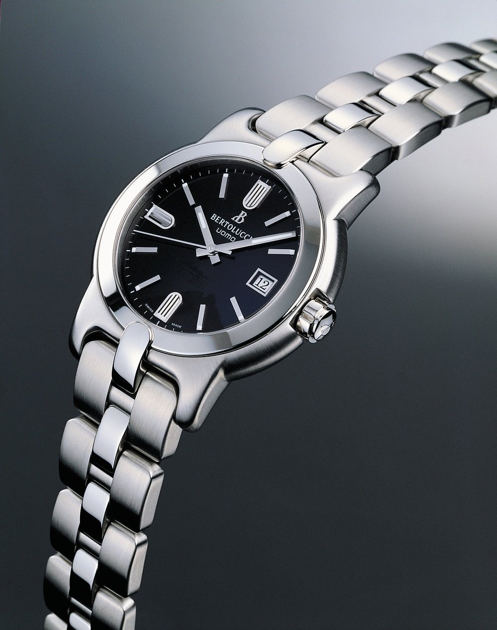 Uomo is available in a medium-size version, 38 mm in diameter instead of 42, which will appeal as much to women as to men. This steel model with a black dial bears all the distinctive hallmarks of the Uomo line, applique hour markers and personalised hands, the brand’s logo at 12 o’clock, and night-time legibility.