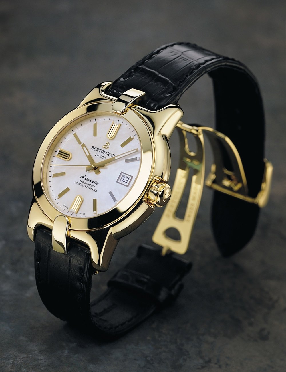 The sporty, elegant Uomo watch was designed primarily for men. This luxurious yellow gold version with a black crocodile strap and yellow gold folding clasp features a mother-of-pearl dial highlighted with gilt appliques. It has a certified automatic chronometer movement and the hours, minutes and seconds are perfectly legible in the dark.