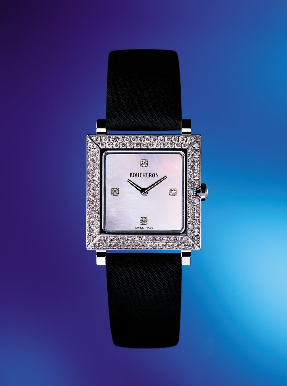 Boucheron’s latest creation is a doubly precious jewel. It has been called Diamond to evoke the “diamond point” motif, made up of a multitude of little pyramids, which personalises its solid gold case. This jewellery model, which comes in two sizes, can also lay claim to its name because of the round diamonds that embellish its bezel, four sides, dial and crown.