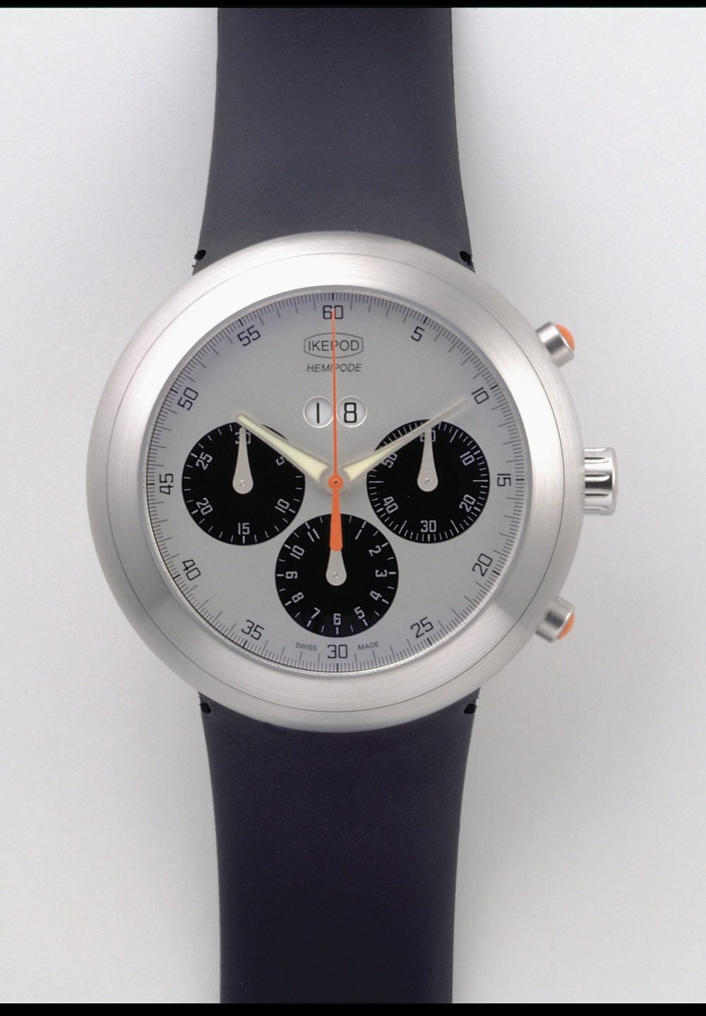 The Hemipode Big Date is a chronograph housed inside a remarkable one-piece case by designer Marc Newson. It is fitted with a Dubois Dépraz 4500 automatic movement. As well as the traditional hour and chronograph indications, it shows the date in a large window at 12 o’clock.