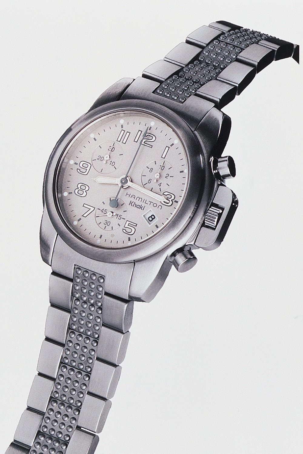 This quartz chronograph is part of a new sporty and sturdy line characterised by a dial that is highly legible both day and night, and by a mobile crown shield. Comprising a dozen models, this line has been added to the Khaki Action collection launched by Hamilton last year and based on a model originally designed for the American army during the two world wars.