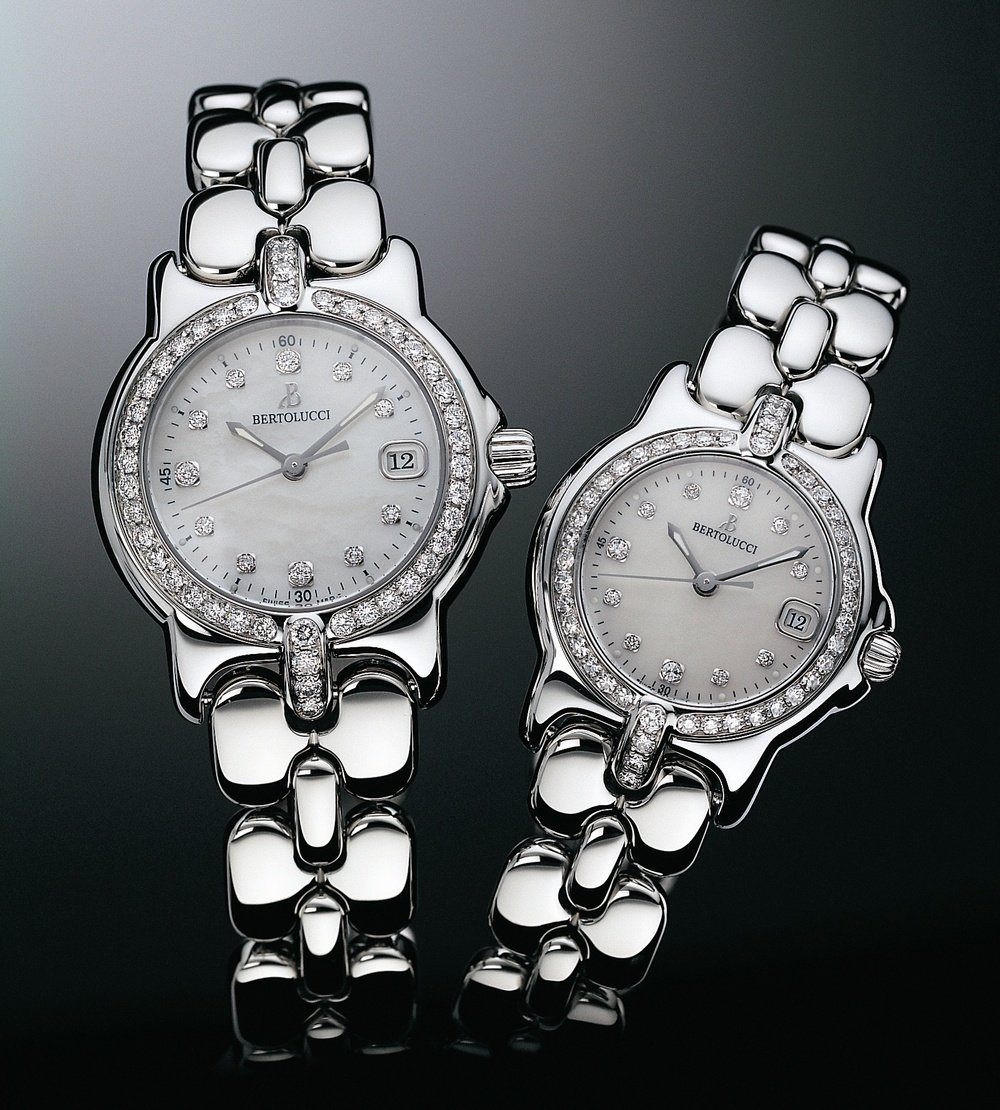 The new additions to the Vir collection have been made exclusively for women in a highly contemporary elegant design. Their soft rounded lines, fashioned in steel in both small and mini sizes, are subtly underscored by the diamonds set in the bezel and the genuine mother-of-pearl dial.