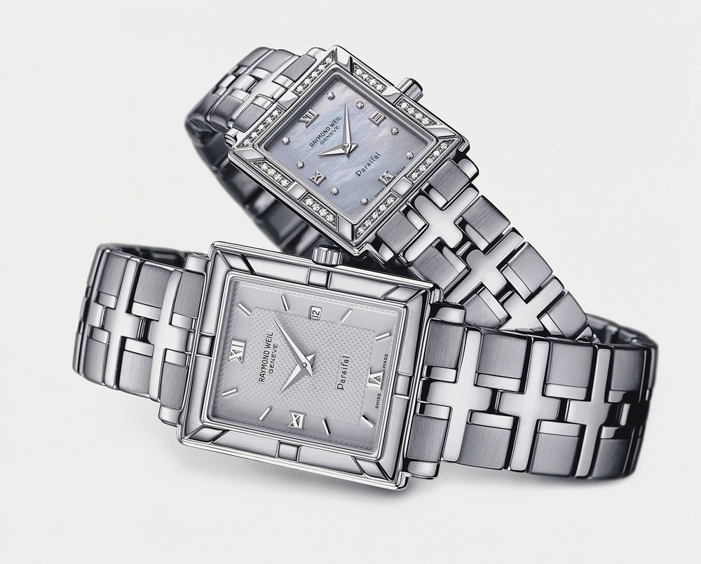 The Parsifal takes on a contemporary look with its new rectangular case. The ladies’ model has a diamond-set bezel and features a genuine mother-of-pearl dial. The men’s model, with a steel exterior and matching Roman numerals on a white dial, takes on a simpler air.