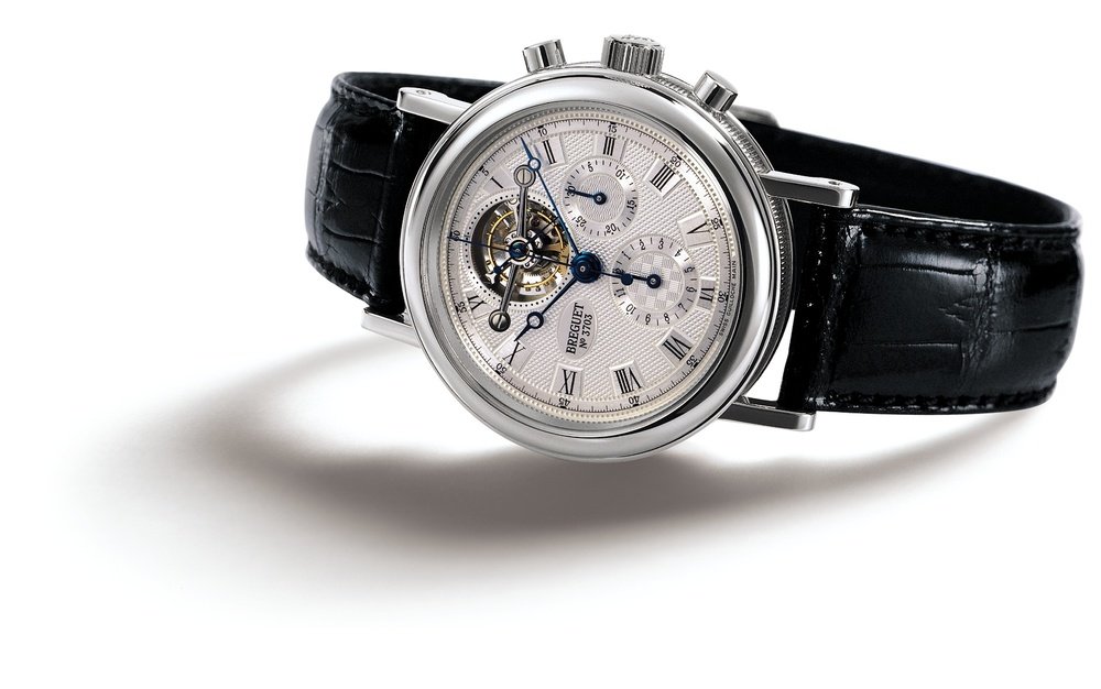In its Classique collection, Breguet offers a new interpretation of the tourbillon, a device patented by the brand’s founder on the 7 Messidor Year 9 in the French Republican calendar. The white gold case has a fluted middle and houses a hand-wound chronograph movement. The tourbillon in its polished steel cage is positioned at 12 o’clock.