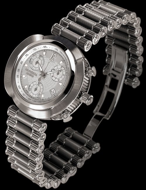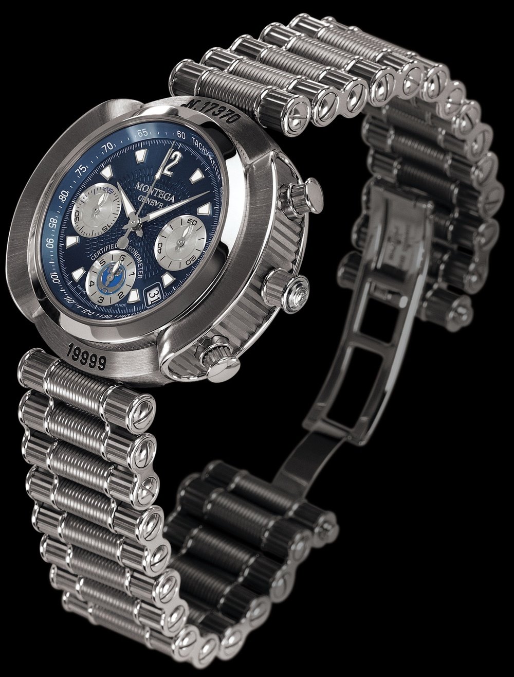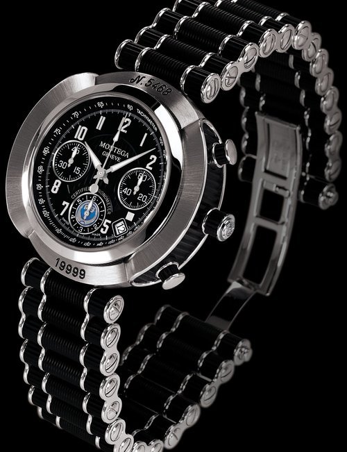 Created by Marc Chatila, the R9 is distinguished by its sophisticated and definitively avant-garde construction. Like a puzzle, the case and bracelet consist of 40 elements all screwed together with no soldering whatsoever. Developed exclusively for Ronaldo, Montega’s ambassador, the chronograph features a 45-minute counter, an allusion to the world of football.