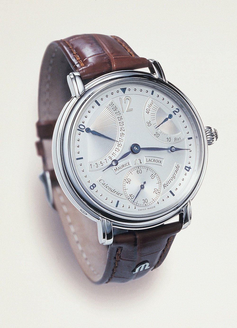 Masterpiece, Maurice Lacroix’s flagship collection, now has a new complication, the retrograde calendar. The elegantly proportioned case sets off to perfection the resolutely technical aspect of this watch, like its-finely worked silver dial. To achieve a balanced effect, the date indicator is situated in a 130° circular segment at 10 o’clock, opposite the power reserve indicator at 2 o’clock. The mechanical movement, with its delicately polished surfaces and blued screws, can be admired through the case back.