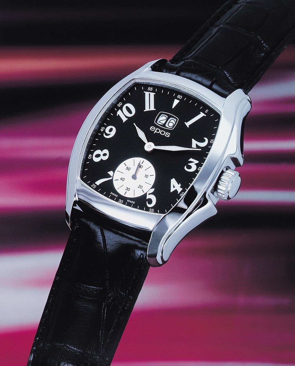 To celebrate the year 2000, the new automatic tonneau from Epos comes in a steel case and puts the date in the place of honour. Displayed on a large calendar window at 12 o’clock, it is cleverly framed by Roman numerals while the rest of the hour circle is in Arabic numerals.