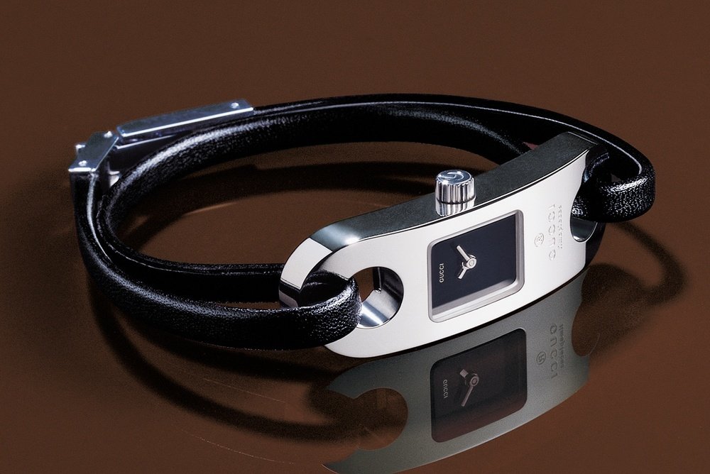Creative and ingenious, this new model from Gucci is simply incomparable ! A simple leather thong, available in several lengths, slips through the case and winds twice around the wrist before closing with an exclusive buckle. The cambered steel case is inspired by the links on one of the brand’s handbag chains. A real jewel !