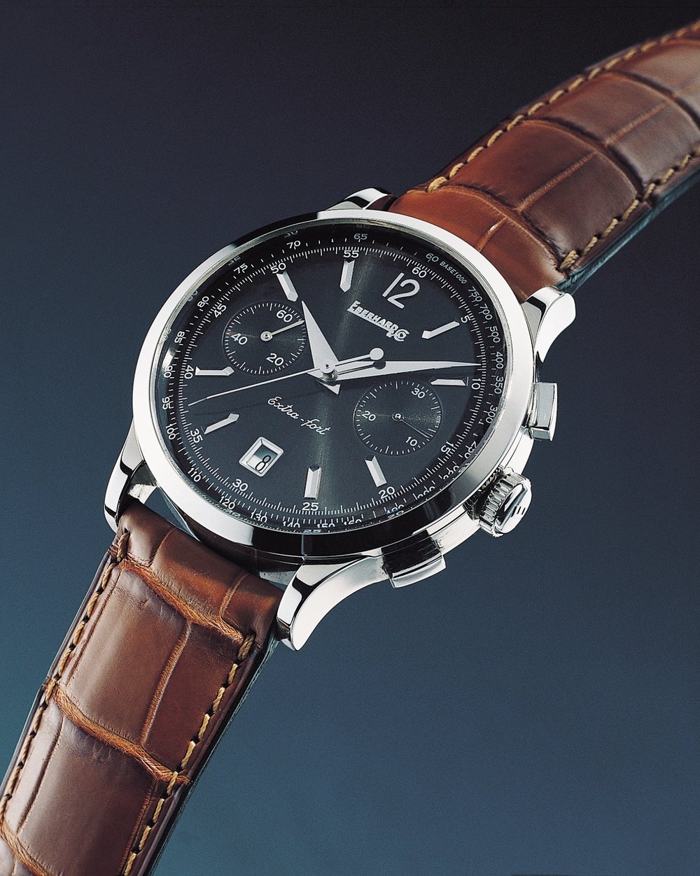 Launched in the 1950’s, the Extra-strong is an automatic chronograph that influenced a whole era and marked an important chapter in the brand’s history. A new, very contemporary version has been brought out for the year 2000 with a steel or solid gold case and a silvered or anthracite dial.
