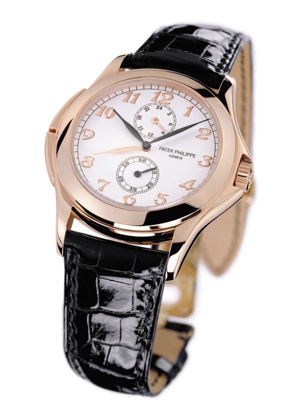 The famous Calatrava in its latest, large-sized version with a smooth bezel incorporates a completely new, manually-operated double time zone system which is easy to use. It shows both the local time (black hand) and the original time, with a day/night indicator at 12 o’clock (gold hand). If this function is not required, the central hour hands are superimposed on each other, gold on black. The black hand is moved with the buttons on the left, one (at 10 o’clock) for backwards and the other (at 8 o’clock) for forwards. If both buttons are accidentally pressed together, then the forward button will respond. Everything remains completely synchronised when the watch is adjusted via the crown.
