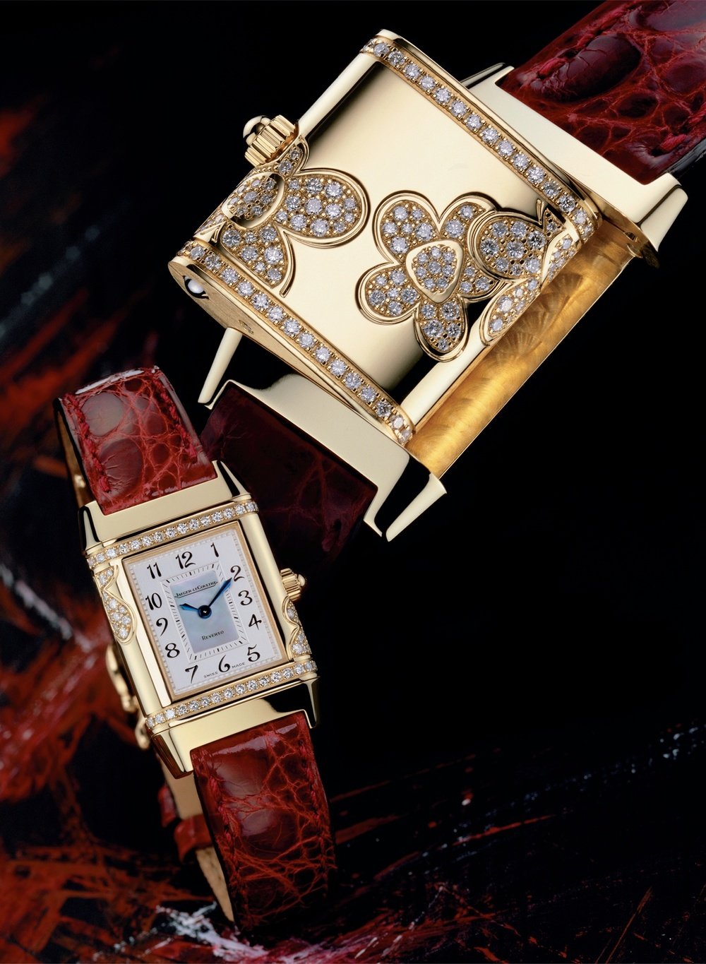 After capturing hearts with its foliage set with superb gems, the Reverso Florale blossoms through its gentle simplicity. Its characteristic dial, decorated with floral numerals, is resplendent with the intoxicating charm of the tiare flower, made up of diamonds. Its case in solid yellow gold is fitted with a quartz movement which is both hand-manufactured and hand-decorated.
