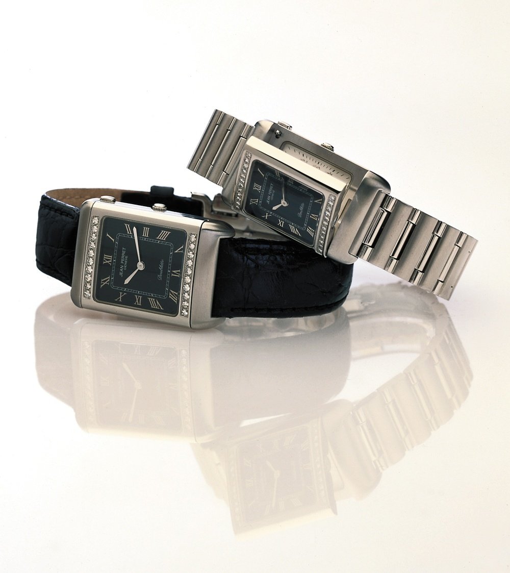 The Doublette from Jean Perret shows the time for two time zones on two quartz watches ingeniously superimposed on each other. A simple mechanism allows the first watch, which has a black dial and Roman numerals, to be lifted up vertically, revealing the second watch with a white dial and Arabic numerals. The entire construction, made of steel, is enhanced with diamonds, for both men and women.