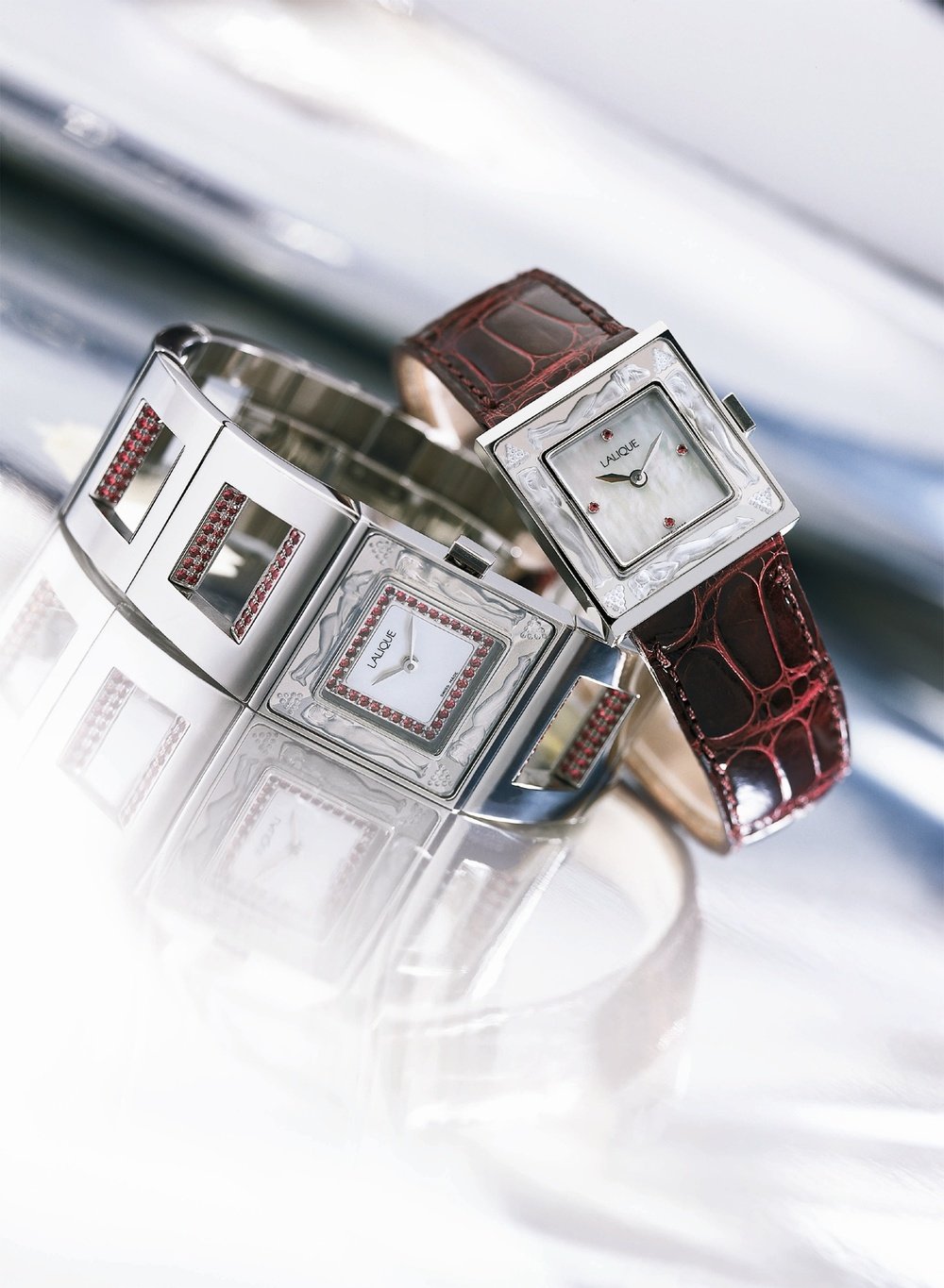 Inspired by classical mythology, the Bacchantes watch depicts four Muses decorated with bunches of grapes. Hand-made in cut crystal, each watch is unique, reflecting the uniqueness of its future wearer. These new variations in coloured stones : ruby, sapphire, and pink or emerald sapphire, augment the Jewellery line of watchmaker Lalique.