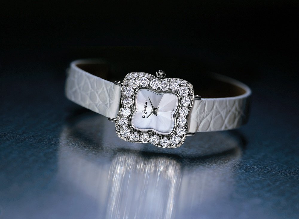 The Butterfly collection, as it name suggests, depicts butterflies with delicate wings in a variety of pastel shades. This model in white gold is set with 2.04 carats of diamonds around a dial in mother-of-pearl and has a crocodile bracelet. Further variations are available with yellow or pink sapphires and satin or lizard bracelets.