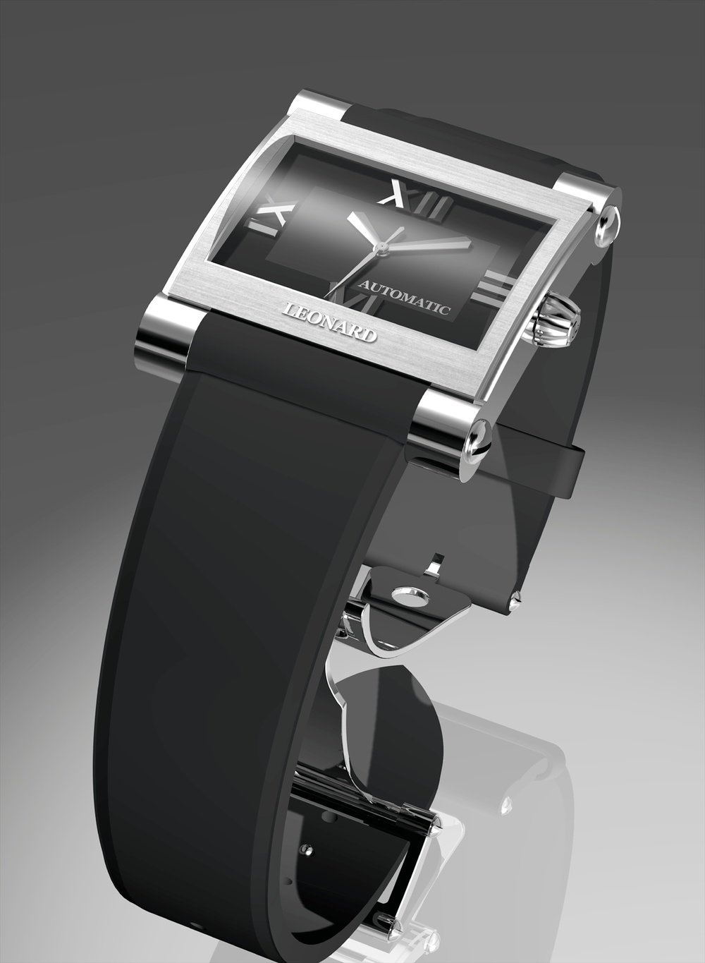 Leonard, a famous Parisian couturier, is launching an extremely personalised collection with a case that is set against a continuous black background, like a Cinemascope screen. Made of steel, it is fitted with an automatic movement, visible through the transparent back, and has a rubber bracelet.